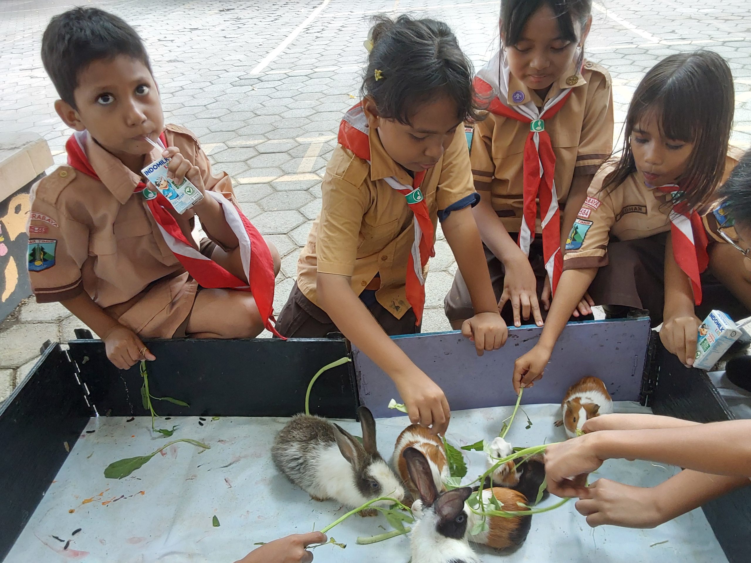 Para siswa sedang memberi makan kelinci pada peringatan Hari Cinta Puspa dan Satwa Nasional (foto: Petrus Riski)